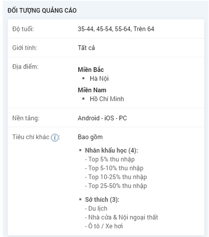 Khi thiết lập các mẫu quảng cáo biệt thự giá cao cấp thì các thông tin chính được đưa vào vào sử dụng như: vị trí, cơ sở hạ tầng, các tiện ích xung quanh, có gần chợ bệnh viện siêu thị, trung tâm thương mại hay không,… nhằm mục đích hướng đánh vào insight của KH mong muốn có một Biệt thự giá trị có thể để dành cho việc đầu tư hoặc sử dụng